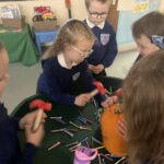 In class we have been working on motor skills, we used a hammer to hammer in nails to decorate a pumpkin. We all found this lots of fun, we had to talk about how to stay safe with tools, how to be good at turn taking and how to be creative.