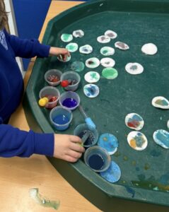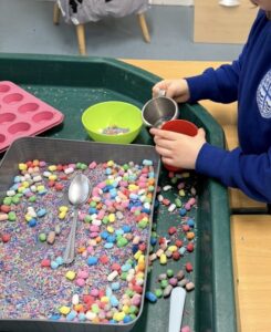 The coloured rice was definitely a favourite sensory activity. All of the class enjoyed ‘What’s in the Box?’ – inside the box were some shiny cheerleader pom poms. Everyone enjoyed looking at them and shaking them. The children did good waiting, good looking and passed the Pom poms on when they’d had their turn. Well done again to everyone!